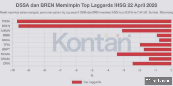 KONTAN.CO.ID – JAKARTA. Indeks Harga Saham Gabungan (IHSG) ditutup melemah 17,76 poin atau 0,24% ke 7.541,61 pada akhir perdagangan Rabu (22/4/2026).
