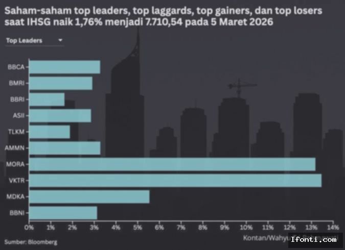Pada Kamis (5/3), IHSG melonjak 133,47 poin atau 1,76% menjadi 7.710,54 pada perdagangan di Bursa Efek Indonesia (BEI).